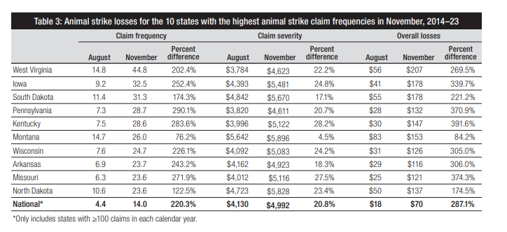 A study in 2014T found that deer collision impact on company auto claims also found that certain vehicle models experienced different levels of damage.